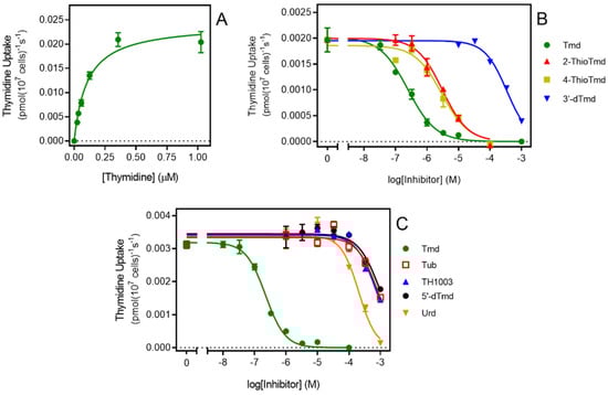 Transport of 0.025 μM [3H]-thymidine by TcrNT2. (A). Michaelis-Menten plot of thymidine uptake by TcrNT2. Cells were incubated for 5 min with 0.025 μM [3H]-thymidine in the presence of variable concentrations of unlabeled thymidine. The experiment is representative of three independent determinations. (B,C). Dose-dependent inhibition of 0.025 μM thymidine uptake by various unlabeled nucleosides as indicated. Tmd, thymidine; tub, tubercidin; urd, uridine; 5′-dTmd, 5′-deoxythymidine. Error bars are SEM from triplicate determinations.