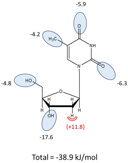 In contrast to the 2′-hydroxy group, the 3′-hydroxy and 5′-hydroxy groups made positive contributions to thymidine binding by TcrNT2, as shown by the following pairwise comparisons: thymidine vs. 3′-deoxythymidine (δ(ΔG°) = −17.6 kJ/mol), of thymidine vs. 5′-deoxythymidine (δ(ΔG°) = −5.26 kJ/mol), and of uridine vs. 5′-deoxyuridine (δ(ΔG°) = −4.41 kJ/mol). For the interaction with the 5′-hydroxy position this yields an average of 4.8 kJ/mol. On the pyrimidine ring, both carbonyl groups also made a positive contribution to thymidine binding, as evidenced by the comparisons of thymidine with 2-thiothymidine and 4-thiothymidine (δ(ΔG°) = −6.33 and −5.86 kJ/mol, respectively). Altogether, this yields a model where TcrNT2 interacts positively with 5-methyl, 2-oxo, 4-oxo, 3′-hydroxy and 5′-hydroxy while a 2′-hydroxy group prevents high affinity binding, through steric or electrostatic effects (Figure 4). The sum of the interactions depicted in Figure 4 is 38.9 kJ/mol, close to the experimental value of −37.5 kJ/mol derived from the experimental Km value (Table 2).