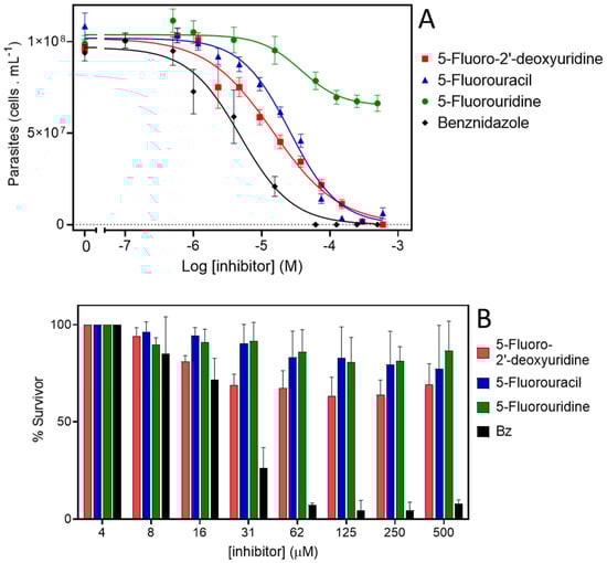 Activity of 5-F-pyrimidines against T. cruzi. (A). Dose response curves of epimastigotes treated with 5-F-2′-deoxyuridine, 5-F-uracil, 5-F-uridine, or benznidazole. Exponentially proliferating epimastigotes were treated with different concentrations of drugs. The parasite proliferation at the middle-exponential proliferation phase was recorded and used to fit a dose–response sigmoidal function. (B). Cell-culture derived trypomastigotes were incubated with different concentrations of 5-F-2′-deoxyuridine, 5-F-uracil, 5-F-uridine, or benznidazole, and their viability was assessed by counting motile parasites in a Neubauer chamber.