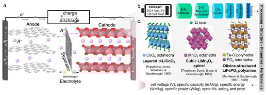 Background and motivation development for secondary battery cathode research: (a) schematic diagram of secondary battery principle of operation; (b) cost segmentation of electric vehicle lithium-ion battery as of 2021 [3]; and (c) conventional cathode materials of the three oxide cathode classifications (Adapted with permission from Ref. [4]. Copyright 2014, The Royal Society of Chemistry). Integral is the foundational understanding of the processing–structure–properties–performance relationship of the cathode materials for the rational design of cost-effective secondary batteries for the intended scale of application.