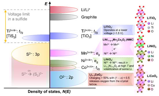 The top of the S2−:3p band limits the access to lower-lying energy bands with higher oxidation states (e.g., Co3+/4+) and hence, higher cell voltage [5]. Lowering of cathode redox energy via access to higher oxidation states in sulfide results in the oxidation of S2− ions to molecular disulfide ions (S2)2− (Figure 2) [5]. Meanwhile, the top of the O2−:2p band lies at lower energy which allows the significant reduction in the redox energy of oxide-based cathodes via access to lower-lying energy bands (e.g., Co3+/4+). This rationale by Prof. John B. Goodenough [40] led to the investigation of the first oxide cathode, layered LixCoO2 (0 < x ≤ 1) [8].