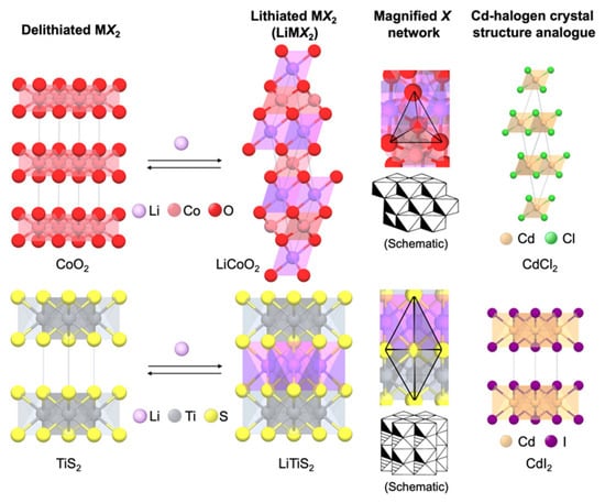 Comparison of the crystal structures [41] of the delithiated and lithiated CoO2 and TiS2, which are analogous to the crystal structures of the close-packed pseudocubic array of CdCl2 and close-packed hexagonal array CdI2, respectively.