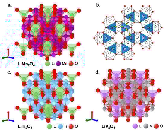 Crystal structures (cubic spinel characterized by space group Fdm) of representative A[B2]X4 framework [41]: (a) LiMn2O4; (c) LiTi2O4; and (d) LiV2O4 and (b) Li-ion diffusion in the framework (Adapted from Ref. [5]).