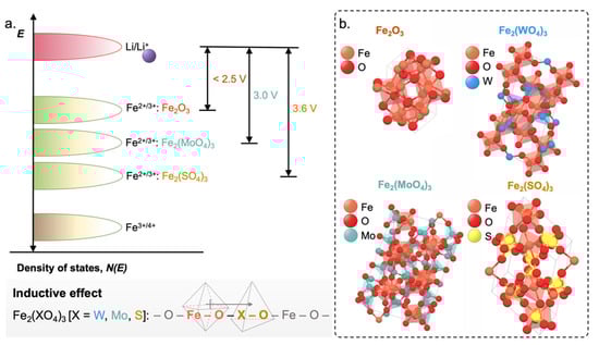 The redox energies of Fe species in Fe-based oxides pose limitations to its performance with respect to the Li anode. The Fe3+/4+ redox energy lies too distant below the Fermi energy of a Li anode and is beyond the electrochemical window of the electrolyte (Figure 5a) [69,70]. Meanwhile, Fe2+/3+ redox energy is too close to that of Li/Li+, which results in a too low voltage of the cell (Figure 5a). This behavior could be related to the strong interactions among the d electrons and the high spin configuration of Fe3+ [70]. Meanwhile, employment of polyanions such as (PO4)3−, (SO4)2−, (AsO4)3−, (MoO4)3−, or (WO4)2− can lower the Fe2+/3+ redox energy to useful levels (Figure 5a) [69]. For example, Fe2(MoO4)3 and Fe2(WO4)3 exhibited a flat discharge voltage of 3 V [9] while Fe2(SO4)3 displayed much higher at 3.6 V [12]. These are significantly higher compared to Fe2O3 or Fe3O4, which had flat discharge voltage <2.5 V operating with the same Fe2+/3+ redox couple (Figure 5a). This trend revealed the effect of counter cations (viz., Mo6+, W6+, and S6+) in shifting the redox energy of the Fe2+/3+. There is a reduction in Fe2+/3+ redox energy and an increase in the OCV versus Li, with increasing strength of covalent bonding within the polyanion. Polarization of the O2− electrons into the strong covalent bonding within the polyanion reduces the bond strength towards the Fe-ion, which consequently lowers its redox energy [69]. Structurally, the Fe2(XO4)3 (X = Mo, W, and S) structure shows that the FeO6 octahedron share its corners with the XO4 tetrahedra (Figure 5b). This provides a three-dimensional –O–Fe–O–X–O–Fe–O– extended linkage. Consequently, the Fe–O bond strength is weakened by the inductive effect of the increased strength of the X–O bond. This results in the lowering of the Fe2+/3+ redox energy and a corresponding increase in the operating voltage with respect to the XO4-free Fe2O3 (Figure 5a).