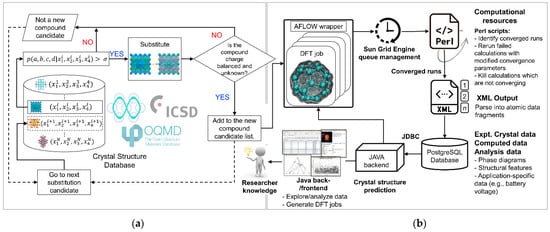 To propose a novel cathode material, Hautier et al. [19] employ a combination of data mining (Figure 7a) with DFT (Figure 7b). Starting with known compounds present in a crystal structure database, their group performs a series of chemical substitutions. Each compound containing as ionic species, the is calculated to evaluate the probability of forming a new compound via substitution of with a, b, c, and d. At a probability higher than a given threshold σ, the substituted structure is considered and added to the group’s list of new compounds, given that the candidate compound is charge balanced and previously unknown [93]. The selected data of the candidate compound, which are Java-coded [94,95,96], are then employed for DFT jobs, wrapped by the Automatic FLOW (AFLOW) [97] using Java back end (Figure 7b). The batches of DFT jobs are submitted to a Grid Engine queuing system [98], where active jobs are monitored and converged using Perl scripts [99]. Completed DFT jobs are inputted into a PostgreSQL [100,101] database, which interfaces with the Java back end through Java Database Connectivity (JDBC). Herein, a graphical front end allows for data exploration and analysis.