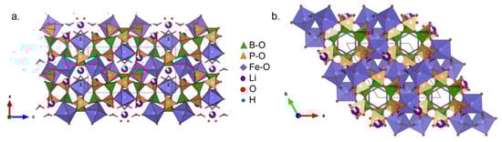 Alkali-ion intercalation in BPO cathodes has been previously reported. Li- and Na-ion intercalation were investigated in Li0.8Fe(H2O)2[BP2O8]·H2O (LiFe-BPO) [109], while Na-ion intercalation [110] was studied in previously synthesized (NH4)0.75Fe(H2O)2[BP2O8]∙0.25H2O (NHFe-BPO) [111] and NaFe(H2O)2[BP2O8]·H2O (NaFe-BPO) [112]. The studied BPO cathodes have similar structures (Figure 8). They are composed of BO4 and PO4 tetrahedra that form helical )m] (Φ = O, OH) chains (Figure 8a). This results in a tube structure joined together by octahedrally coordinated FeO6. The tunnel-like structures host free H2O molecules (Figure 8b). Pores created by FeO6 can host the alkali metal ions. The tube structure and the presence of redox-active Fe in the BPO provide the potential for alkali metal intercalation required for secondary battery cathode application.