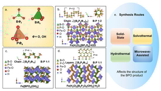 (a) The construction of BPO structures consists of at least one borate unit, three- or four-coordinated, BΦ4 and one phosphate unit, PΦ4. (b) Fe(H2O)2[BP2O8]∙H2O (bottom) [131] with its BPO 1D helical chain FBU structure (top). (c) Fe[BPO4(OH)2] (bottom) [132] with its BPO 1D chain FBU structure (top). (d) Fe(H2O)2[B2P2(OH)2]∙H2O (bottom) [133] with its BPO 2D 63 net-topology FBU structure (top) (FBUs were adapted with permission from [130]. Copyright 2007, WILEY-VCH Verlag GmbH & Co. KGaA, Weinheim). (e) Synthesis routes of BPO compounds.