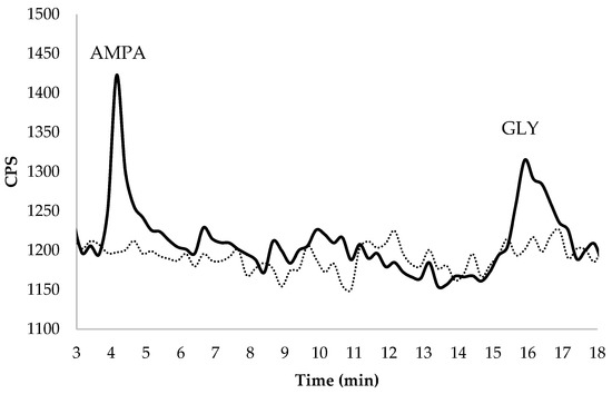 In order to develop the HPLC-ICP-MS/MS for the detection of GLY and AMPA, the first experiments were realized to select the optimal reaction gas flux, instrument parameters, appropriate mobile phase concentration, and column characteristics in the analysis of ultrapure water with standard addition. In order to study how it is possible to quantify GLY in more complex solutions and an eventual matrix effect, the method was applied in groundwater spiked with GLY and AMPA (Figure 1).