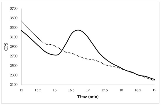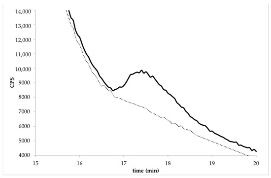 Chromatogram of WR (Caravaggio variety) at the spiked level of 0.01 mg kg−1 by HPLC-ICP-MS/MS. The dotted line represents the same un-enriched sample.