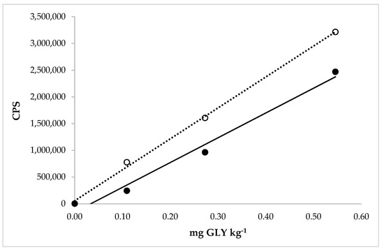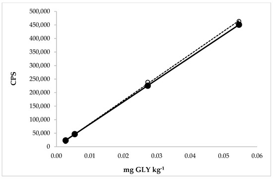 Comparison between the calibration curves of GLY in the extraction solution (dotted line) with linear equation y = 8.543 × 106x − 244.4 and regression fit 0.999 and in the extraction solution with the matrix (white rice, solid line) with linear equation y = 8.240 × 106x + 1100 and regression fit 1.000.