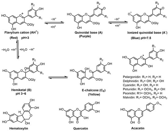 Chemical structures of flavonoids (anthocyanins, hematoxylin, quercetin and acacetin) and the effect of pH on anthocyanin structure and resultant color.