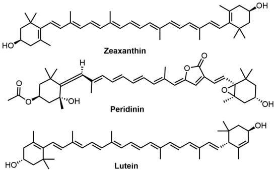 Molecular structures of zeaxanthin, peridinin, and lutein.