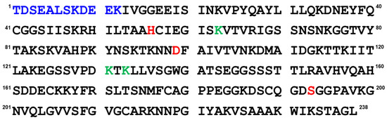 Cocoonase shares a high homology with trypsin (Supplementary Materials Figure S2) [10]. Based on a homology alignment, the putative catalytic residues are assigned to the His56, Asp99, and Ser193 residues. However, this has not been confirmed by experimental data. In addition, it is also noteworthy that the folding mechanism of cocoonase has not been studied when the catalytic residues are mutated to inactive residues to eliminate the nonspecific degradation that occurs during the refolding reaction. Therefore, to determine the catalytic residues, we prepared mutant proteins in which the putative catalytic residues were mutated in addition to the degradation-suppressed mutations and estimated the enzyme activity and conformation of these molecules.
