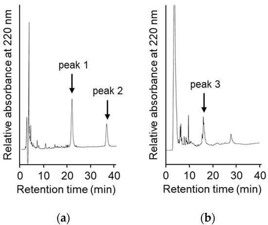 High Performance Liquid Chromatography (HPLC) profiles of the reaction solutions of the auto-processing of the recombinant proCCN (a) and [K63G]-proCCN (b). The reaction solutions at lanes 8 in Figure 2a,b were purified by RP-HPLC (a,b), respectively. Waters and Hitachi HPLC systems were used to analyze the reaction solutions.