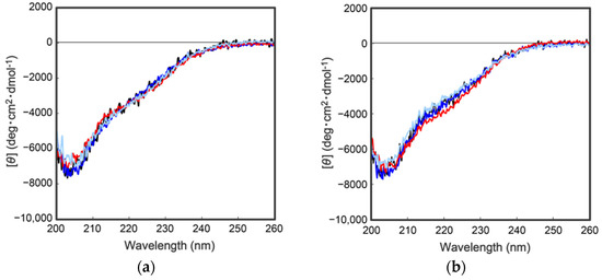 CD spectra of a series of proCCN (a) and the cassette mutated proCCN proteins (b). The black, blue, red, and light blue represent the CD spectrum of proCCN’, [H56A]-proCCN’, [D99A]-proCCN’, and [S193A]-proCCN’, respectively.