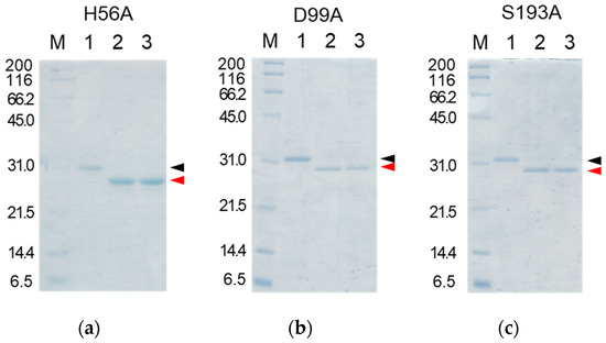 The mutant proCCN’ proteins were treated with enterokinase, yielding the mature mutant proteins, [H56A]-proCCN’, [D99A]-proCCN’, and [S193A]-proCCN’, as shown in Figure 7a–c. The mature CCN’ mutant proteins were then treated with an enterokinase capture kit according to the manufacture’s recommendations. The resulting mutant CCN’ proteins did not show any protease activity on the casein zymography assay while the CCN’ proteins that were auto-processed from proCCN’ or [K8D]-proCCN’ showed active protease bands (white bands) on the gels, as shown in Figure 8a. The active protease bands of the CCN’ proteins in lane 1 in Figure 8a (upper in the left column) were also observed before the auto-processing reaction since trace amounts of the mature forms had already been produced before the reaction. In addition, an enzyme assay using Bz-Arg-OEt clearly indicated that the mutant CCN’ proteins, in which the catalytic residues had been mutated, did not possess protease activities, as shown in Figure 8b. The in silico analyses of the cocoonase using Alphafold2 suggested that the putative residues form a catalytic triad at relatively the same positions as that of trypsin (PDB ID: 5T3H), as shown in Supplementary Materials Figure S3 [22]. Therefore, we conclude that the His56, Asp99, and Ser193 residues are the actual participants in the catalytic triad.