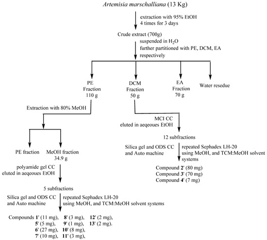 - Abilova, Z.; Yuan, J.; Janar, J.; Tang, C.P.; Ye, Y. Monomeric and dimeric sesquiterpene lactones from Artemisia heptapotamica. Chin. J. Nat. Med. 2019, 17, 785–791. [Google Scholar] [CrossRef]