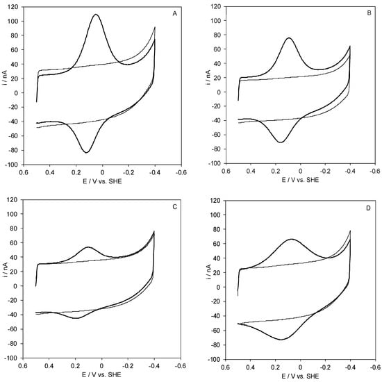 Cyclic voltammograms for wt Streptomyces coelicolor small laccase (SLAC) covalently bound to a SAM of MUA (A), 1:1 MUA/MU (B), 1:2 MUA/MU (C), and 1:3 MUA/MU (D) through NHS/EDC chemistry. CVs were recorded in 5 mM Tris-HCl buffer, 5 mM sodium perchlorate, pH 7. Scan rate: 0.05 V s−1, T = 20 °C.