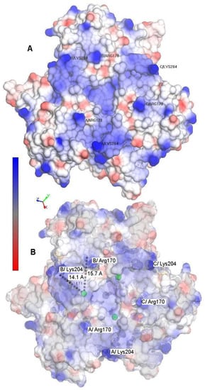 (A) Surface electrostatic potential of the homo-dimeric Streptomyces coelicolor small laccase (SLAC) showing neutral (white), positively (blue) and negatively (red) charged areas. The three monomers are labeled A, B, and C. The figure was prepared using the NOC 3.01 package from the X-ray structure (PDB code 3CG8) [42]. (B) Schematic representation of SLAC with a decreased opacity. The T1 copper ions are depicted as green dots. The Arg170 and Lys204 residues for all subunits are highlighted. The distances form the T1 copper center to the selected residues of subunit B are calculated from the crystallographic structure.
