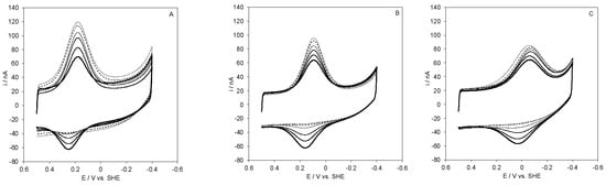The SLAC surface coverages (Γ0) for the electrostatic protein immobilization decreases with decreasing MUA content of the SAM (Table 1), namely in the order: MUA > MUA/MU 3:1 > MUA/MU 1:1 > MUA/MU 1:2, hence with decreasing the negative charge density of the SAM surface (Table 1). In parallel, the CV peak currents decrease in the same order. Both effects are clearly the result of the decreased electrostatic SAM/protein interaction. The surface coverage follows the same order for covalent protein immobilization using the EDC/NHS chemistry (Table 1) because the coverage is determined by the first step of protein–SAM interaction, which is electrostatic and precedes ester bond formation. In all cases, the amounts of immobilized electroactive protein are much lower than those that were obtained with other procedures [49,50] possibly due to unfolding effects induced by the SAM surface or, more likely, to the presence of several positively charged regions on the protein surface, responsible for the protein–SAM attachment, of which only a few allow for efficient ET. No appreciable changes in the electrochemical responses for SLAC on the various functionalized electrodes were observed between 5 and 45 °C. For the protein covalently immobilized on a MUA/MU-coated gold electrode, CVs that were recorded at different pH values and increasing exposure to atmospheric dioxygen are shown in Figure 4.