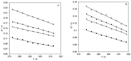 E°′ vs. T plots of Streptomyces coelicolor small laccase (SLAC) immobilized on a gold electrode coated with electrostatically (A) MUA (●), 3:1 MUA/MU (×), 1:1 MUA/MU (▲), 1:2 MUA/MU (□), or covalently (B) MUA(EDC/NHS) (●), 3:1 MUA/MU (EDC/NHS) (×), 1:1 MUA/MU (EDC/NHS) (▲), 1:2 MUA/MU (EDC/NHS) (□), respectively. pH = 7.0. Reduction entropy (ΔS°′) is calculated from the slope of the linear regression lines. The error bars are not shown because they have the same dimension of the symbols.