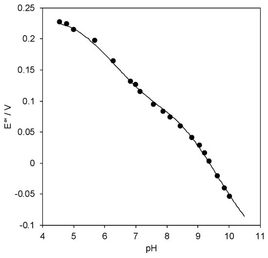 The pH dependence of E°′ for SLAC covalently bound to 1:1 MUA/MU-functionalized gold electrode through the EDC/NHS linkage procedure is shown in Figure 7. The reduction thermodynamics at the selected pH values of 7.0, 8.4, and 9.6 are listed in Table 1. The E°′ vs. pH plot exhibits two linear regions, the former between pH 5.7 and 7.9 and the latter starting at about pH 9, with a slope of 58 and 85 mV per pH unit, respectively, corresponding to the loss of about one and two protons with small pKa differences. The pH profile and the overall E°′ change at the two extremes of pH is consistent with that which was observed previously for the same species immobilized on pyrene- and neocuproine-modified graphite disc electrodes [44]. The data were fitted to a three-equilibria equation involving one and two reduction induced proton uptake at low and high pH, respectively: