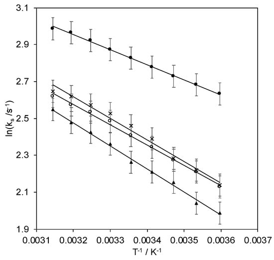 ln ks vs. 1/T plots of Streptomyces coelicolor small laccase (SLAC) covalently bound to 1:1 MUA/MU gold electrode through EDC/NHS linkage procedure at different pH values: pH = 7.0 (○), pH = 8.4 (●), pH = 9.6 (▲), and electrostatically immobilized on 1:1 MUA/MU gold electrode at pH = 7.0 (×). Activation enthalpies (ΔH#) are calculated from the slope of the linear regression curves.
