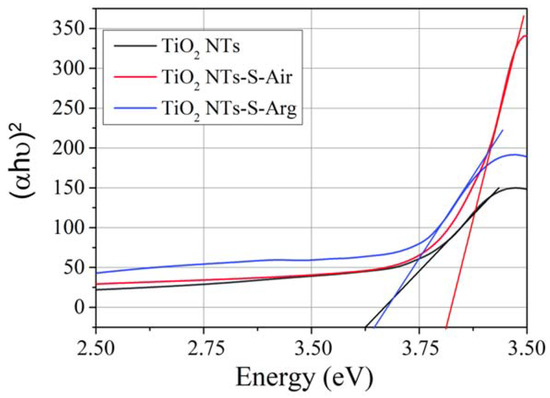 The optical band gap of TiO2 NTs and TiO2 NTs/CuxO was calculated using the Kubelka–Munch theory [32]. The corresponding graphical constructions are shown in Figure 4. The equations were used for semiconductors with direct band-to-band transitions. It was demonstrated earlier [33] that this approach provides reliable results for titanium-dioxide nanostructures. It is due to the size effect when crystal structure undergoes changes because of substance volume decrease; this results in an increased probability of direct band-to-band transitions. Conversion of an indirect semiconductor into a direct one is commonly described from the viewpoint of DFT theory [33].