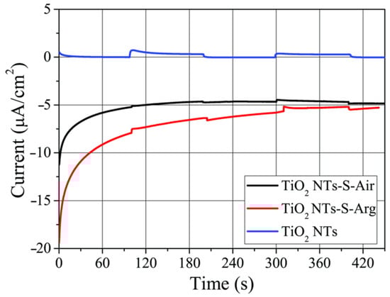 The photoactivity of the obtained samples was evaluated by chronoamperometry in a three-electrode photoelectrochemical cell (Figure 5 and Figure 6).