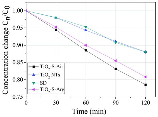 From the data obtained, it can be concluded that the TiO2-S-Air and TiO2-SArg samples have the best photocatalytic properties (a change in the dye concentration of approximately 20%) comparing to the TiO2 NTs. The use of the TiO2 NTs sample did not add an effect compared to the self-degradation of methylene blue molecules under illumination (approximately 10%). This indicates the absence of catalytic activity of TiO2 NTs under visible light irradiation, which is consistent with the literature data.