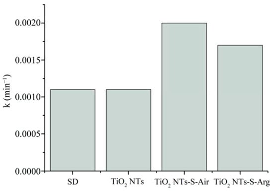 To evaluate the efficiency of methylene blue molecules decomposition by all the studied samples, the reaction rate constants were calculated. The TiO2-S-Air and TiO2-S-Arg samples have a high reaction rate constant (approximately 0.002). The smallest reaction rate constants, equal to 0.001, were found during dye self-degradation and when using TiO2 NTs (Figure 8).