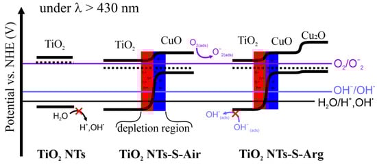 As a result of the spatial charge region formation at the TiO2/CuO interface, the current of the main charge carriers (e−) in n-type semiconductors is strongly suppressed, which is confirmed by the results of measurement of photocurrent dependencies. The region of spatial charge depleted by electrons (e−) in TiO2 can be comparable with the small (~50 nm) thickness of the walls of nanotubes, which can lead to almost complete blocking of the current through the volume of the nanotube. In the case when the depletion region formed at the TiO2/electrolyte interface completely overlaps TiO2, this does not prevent the reaction of photogenerated holes with adsorbed water molecules and OH− ions. The photogenerated electrons move towards the cathode through an electrical circuit. In turn, the H+ ions formed during the water decomposition reaction migrate through the electrolyte volume and are reduced at the cathode, thereby closing the electrochemical circuit. In the case of the arrays of TiO2 nanotubes with CuO or Cu2O on their surface, the current of photogenerated holes will be directed to copper oxide. The valence band potential of copper oxide is insufficient for the water decomposition reaction to proceed: without additional bias the holes can only recombine in the volume of copper oxide without contributing to the photocurrent. However, this does not affect photocatalysis, because the mechanism of decomposition of organic substances in our case is different. Let us discuss it.