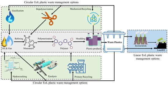 A comparative analysis of linear and circular EOL waste plastics management techniques.