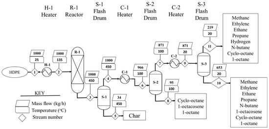 The material balance for the process with two decimal fractions is given in Table 3 based on the simulation stream results. Moreover, based on the product distribution, the net heating value of the liquid and gaseous products and their respective enthalpies are shown in the Table 3. Based the experimental [37] as well as the simulation results, it was shown that no residual solid or char was formed in the reactor, so S-1 did not separate any solids. Therefore, whatever came from the S-2 stream went out of the S-1 top to S-2 through a series of coolers, as seen in S-3 and S-4. S-2 separated the products into two fractions of gaseous and liquid products, as shown in Table 3. The bottom fraction was liquid hydrocarbons, and the top product was gaseous hydrocarbons, as represented in streams 7 and 8, respectively.
