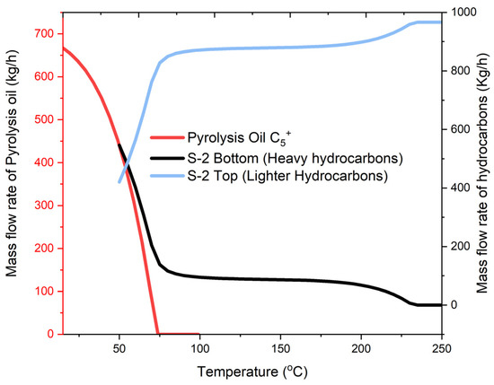 Based on the studies in the literature, sensitivity analysis of both the pyrolysis and hydrocracking processes was conducted in order to optimize the product distribution using ASPEN Plus. Both reactors were considered optimized based on the experimental conditions. However, other equipment needs to be optimized. First, in the pyrolysis process, the optimum temperature of C-1 was obtained by performing a sensitivity analysis of the products formed in the process. On cooling the hydrocarbon products coming from S-1 below 250 °C, an increased amount of S-2 bottom output was observed as shown in Figure 5. A steady product output from S-2 was obtained by further decreasing the temperature. As the temperature dropped below 100 °C, there was a sudden increase in the S-2 bottom products due to the condensation of hydrocarbons below C8. Further condensation would cause the carryover of gasoline-range compounds into the heavier compounds. Therefore, 100 °C was considered the optimum temperature for C-2. This ensured the complete removal of the heavy hydrocarbon C20+ from the product stream. Moreover, the sensitivity for the pyrolysis products (i.e., oils) due to the variation of condenser temperature (C-2) was observed. Interestingly, decreasing the temperature below 70 °C resulted in the condensation of C5+ compounds. On further cooling, the liquid product obtained from S-3 went on increasing exponentially and was steadied below 25 °C. Therefore, C-2 was set at 20 °C above the ambient temperature in order to obtain a yield of about 65% of the liquid product.