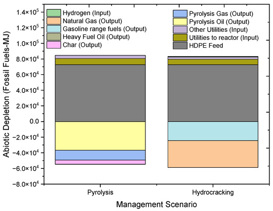 Similarly, the overall abiotic depletion results for both the pyrolysis and hydrocracking processes are compared in Figure 8. The abiotic depletion impact category effects are measured in terms of the amount of energy utilized, i.e., MJ. The overall impact of the depletion of fossil fuels for pyrolysis is 29,901.52 MJ, and for hydrocracking it is 24,528.46 MJ. The impact created with the use of HDPE as the feed is equal. The input utility used in pyrolysis creates an impact of 11,915.8 MJ, which is more than 1.2 times that of the hydrocracking process. The oil generated in the pyrolysis process creates a positive impact of −36,652.54 MJ as compared to gasoline fuel, −24,380.7 MJ in the hydrocracking process. The major difference in the results of the two processes is due to the lower contribution of pyrolysis products as compared to hydrocracking. Overall, pyrolysis produces a greater impact on the environment in the category of fossil fuel depletion.