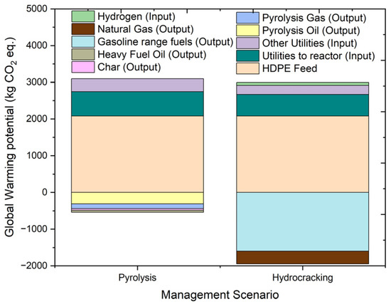 Climate change is the potential group of global warming potential, and it refers to the variation in the global temperature caused by the release of greenhouse gases [39]. Global warming potential (GWP) is used in LCA to measure greenhouse gas emissions, which increase the natural greenhouse effect due to the adsorption of Earth’s emissions [40]. It works as an impact indicator which measures the changes in the global temperature and climatic conditions [38]. Figure 9 shows the overall climate change results for the pyrolysis and hydrocracking of HDPE. The impact category of climate change or the global warming potential is measured in kg CO2 equivalents (kg CO2 eq.). In the case of global warming potential, pyrolysis has an impact of 2557.997 kg CO2 eq., and hydrocracking has an impact of 1049.399 kg CO2 eq. The input used in both of these processes is the same, so the GWP impact is nearly similar with a slightly higher impact from the hydrocracking process due to the presence of hydrogen in the feed. The utility input in terms of electricity used has a slightly lower impact on global warming in the case of hydrocracking as compared to pyrolysis, with the values of 835.2 kg CO2 eq. and 1019.2 kg CO2 eq., respectively. For hydrocracking, overall GWP is benefitted by a higher positive impact caused by the production of gasoline-range products which is 5.17 times the impact caused by the production of pyrolysis oil. In conclusion, hydrocracking shows an overall lower climate change impact on the environment as compared to pyrolysis.