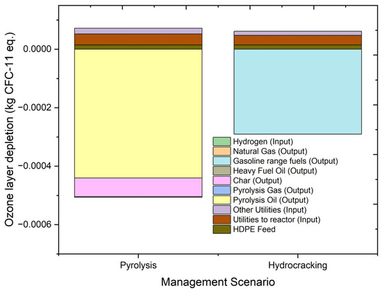 Impact assessment of pyrolysis and hydrocracking for the management of waste HDPE on ozone layer depletion (kg CFC-11 eq.).