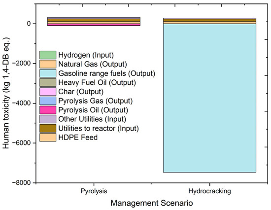 Human toxicity potential is a direct indicator that denotes the effect of toxic chemicals on humans. Human toxicity potential is defined as the potential effect a toxic chemical can have upon human life. A high toxicity potential can cause life-threatening diseases like cancer in humans. The overall results of human toxicity and individual contributions from the contributing factors are indicated in Figure 11. Human toxicity is measured in terms of kg 1,4 dichlorobenzene equivalent (kg 1,4-DB eq.). The overall results of the effect on humans in terms of human toxicity are 208.9515 kg 1,4-DB eq. and −7194.09 kg 1,4-DB eq. for the pyrolysis and hydrocracking processes, respectively. Gasoline-range fuels and natural gas produced in the hydrocracking process contribute about −7476.35 kg 1,4-DB and −1.73513 kg 1,4-DB eq. to human toxicity, respectively, while the oil and gas produced during pyrolysis contribute −91.9663 kg 1,4-DB eq. and −0.634 kg 1,4-DB eq., respectively. Hydrocarbon fuel outputs contribute positively to the environment, as they reduce the impact caused when producing the same products from conventional sources. The input values for human toxicity are higher for pyrolysis, as the utility requirement is higher in that case. In the case of hydrocracking, the overall value of human toxicity is benefited by the production of gasoline fuel in the process. Overall, there is a huge gap in the results of human toxicity when pyrolysis and hydrocracking are compared, and a viable option (i.e., hydrocracking) is present for the management of waste plastics after considering its beneficial results on human toxicity.