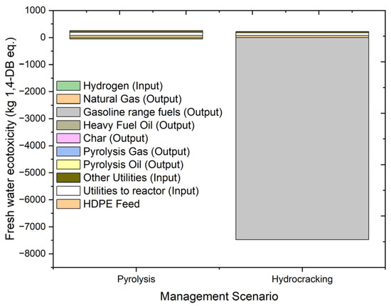 The effect of emissions or chemicals on the ecosystem is known as ecotoxicity. Ecotoxicity is measured as the impact of toxic substances on freshwater, marine, and terrestrial ecosystems. The effects of ecotoxicity are loss of biodiversity and extinction of species, which in turn damage the quality of the ecosystem. Figure 12 shows the impacts of hydrocracking and pyrolysis and the individual contributions of inputs and outputs to freshwater ecology. The unit used for measuring fresh water ecotoxicity is kg 1,4 dichlorobenzene equivalent (kg 1,4-DB eq.).