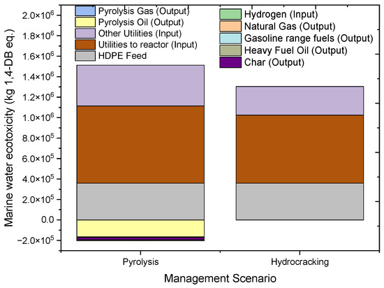 Impact assessment of pyrolysis and hydrocracking for the management of waste HDPE on marine aquatic ecotoxicity (kg 1,4-DB eq.).