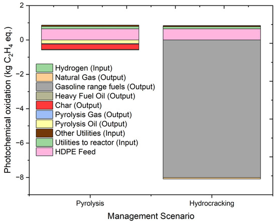 Overall, pyrolysis has an impact of −0.00044 kg CFC-11 eq., and hydrocracking has an impact of −0.00023 kg CFC-11 eq. The contribution of utility to the overall results is slightly higher in the case of pyrolysis due to higher utility usage. Additionally, the contribution of pyrolysis products would require the process to burn fossil fuels, which would affect the ozone layer and contributes positively to the environment. Gasoline-range fuels produced during the hydrocracking process have a value of −0.00029 kg CFC-11 eq. as compared to −0.00044 kg CFC-11 eq. of pyrolysis oil. Pyrolysis oil produced in the process plays a deciding factor in defining the overall impact of the two processes. The overall effect of both of the processes on ozone depletion is nearly the same. However, numerically, pyrolysis has a greater positive impact on ozone layer depletion potential than the hydrocracking of HDPE feed.