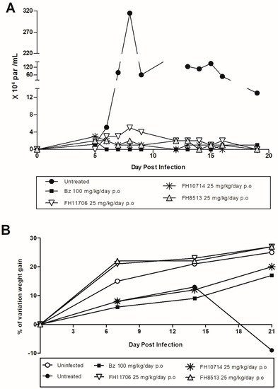 FH11706, FH10714, FH8513 and Bz activity on male Swiss mice infected with 104 bloodstream trypomastigotes (Y strain). (A) Parasitemia curve. (B) Percentage (%) of mouse weight variation.