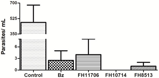 To explore in vitro parasitic exhaustion, T. cruzi-infected L929 cultures were incubated for seven days with the compounds at 10 μM. Then, fresh drug-free medium was added and replaced every 48 h. After seven days of incubation, the number of released parasites into the supernatant was quantified by light microscopy. All of the derivatives reduced the number of released parasites, but only FH10714 cleared the parasitism (Figure 4).
