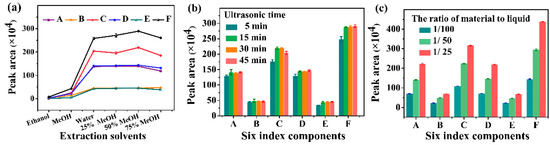 Optimization of sample preparation conditions of GR formula granules. (a) the effect of extraction solvents including ethanol, MeOH, water, 25% MeOH, 50% MeOH, and 75% MeOH, on the extraction efficiency of six index components; (b) the effect of ultrasonic time (5, 15, 30, and 45 min) on the extraction efficiency of six index components; and (c) the effect of the ratio of material to liquid (1/100, 1/50, and 1/25) on the extraction efficiency of six index components.