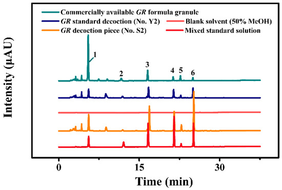 Typical HPLC chromatogram of blank solvent (50% MeOH), GR decoction piece (No. S2), GR standard decoction (No. Y2), commercially available GR formula granule, and mixed standard solution.