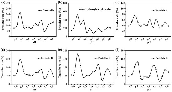 The effect of pH on the transfer rate of six index components, incuding (a) gastrodin, (b) p-hydroxybenzyl, (c) parishin A, (d) parishin B, (e) parishin C, and (f) parishin E in GR standard decoction at weak acid environment.