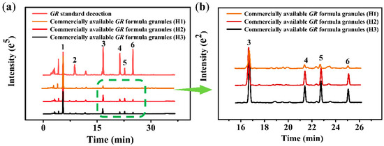 (a) Comparison of HPLC fingerprints between 3 batches of commercially available GR formula granules (H1, H2, and H3) and GR standard decoction. (b) Enlarged view of the mark areas with green lines in (a).