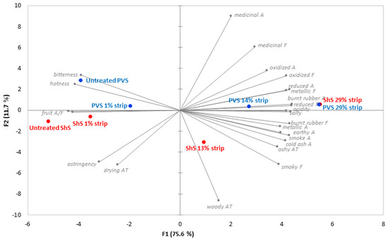 Significant differences were perceived in the sensory profiles of ShS and PVS wines before and after SCC distillation (Figure 2, Table S2). The intensity of fruit aroma and flavor diminished, while the perception of smoke, cold ash and burnt rubber aromas, and smoky, medicinal and burnt rubber flavors intensified as a function of stripping. The characteristic ashy aftertaste often associated with smoke-tainted wines also became more apparent with SCC treatment. The loss of fruit expression can be attributed to the removal of desirable aroma volatiles, which occurs as an outcome of SCC distillation, in addition to dealcoholization [39]. Gas chromatography-mass spectrometry (GC-MS) analysis confirmed the presence of fermentation volatiles (alcohols and esters) in each of the condensate fractions (Table S3); their lower boiling points (relative to volatile phenols) likely aided their removal during SCC distillation (Tables S1 and S2). The extraction of volatiles responsible for fruit aroma and flavor, together with concentration of free and glycosylated volatile phenols provides a plausible explanation for the perceived intensification of smoke taint following SCC treatment. The biplot generated from principal component analysis of sensory data (Figure 2) shows clear separation of wines along the x-axis according to the degree of stripping; with the first principal component accounting for 75.6% of the total variance. Untreated wines were positioned furthest to the left, reflecting predominant fruit expression, while stripped wines moved progressively to the right, due to the intensification of smoke taint sensory characters.