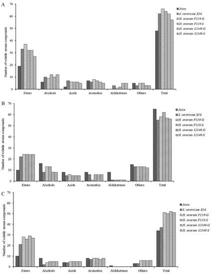 The aroma compounds in fruit wines, mainly produced by alcoholic fermentation through yeast, have a prominent contribution to the quality characteristics of fruit wines [20]. Thus, the aroma compounds content is of great significance for the quality of fruit wines and is a key indicator of their quality. The aroma compounds in the three fruit wines were detected and analyzed using HS–SPME–GC–MS. Six major aroma compound classes were detected, including esters, alcohols, acids, aromatics, aldoketones, and others. In total, 48 aroma compounds were detected in the R. roxburghii juice before fermentation. In addition, 62 (S. cerevisiae X16), 66 (H. uvarum F119-G), 64 (H. uvarum F119-S), 62 (H. uvarum 32349-G), and 57 (H. uvarum 32349-S) volatile aroma chemicals were detected in R. roxburghii fruit wine under the respective fermentations (Figure 1A). Moreover, 65 volatile aroma compounds were detected in blueberry juice. Fifty-five (S. cerevisiae X16), 58 (H. uvarum F119-G), 62 (H. uvarum F119-S), 57 (H. uvarum 32349-G), and 56 (H. uvarum 32349-S) volatile aroma compounds were detected (Figure 1B) in blueberry wine. Finally, 34 volatile aroma compounds were detected in plum juice. An amount of 37, 51, 50, 52, and 51 volatile aroma compounds were detected in the S. cerevisiae X16, H. uvarum F119-G, H. uvarum F119-S, H. uvarum 32349-G, and H. uvarum 32349-S fermentation treatments, respectively (Figure 1C). In addition, the yeast-fermentation capacity increased the number of aroma compounds, predominantly esters, in the fruit wines. As a result, H. uvarum–Saccharomyces cerevisiae mixed fermentation increased the variety of aroma compounds and the richness of R. roxburghii and plum fruit wines.